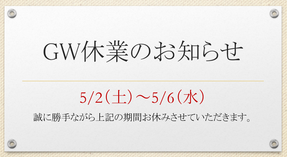 投稿日: 2026年4月7日 お知らせGW休業のお知らせ 誠に勝手ながら下記の期間お休みさせていただきます。 2025年5月2日(土)~2025年5月6日(水) ご不便 … “GW休業のお知らせ” の続きを読む